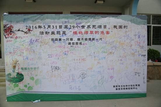 活动现场,通过悬挂横幅、摆放展板、发放宣传材料等多种形式宣传吸烟和二手烟暴露的危害。同时还举行了“拒绝吸第一支烟,做不吸烟的新一代”签名活动,200余名参加活动的师生在禁烟横幅上签下自己的名字,表达了自己创建无烟校园、拒吸第一支烟的决心。活动还就学生们关心的结核病、慢性病等其他传染病的预防和控制进行了讲解。另外,还将通过举办无烟生活健康知识巡讲、评选无烟明星等活动广泛宣传吸烟和二手烟的危害,倡导健康生活方式。