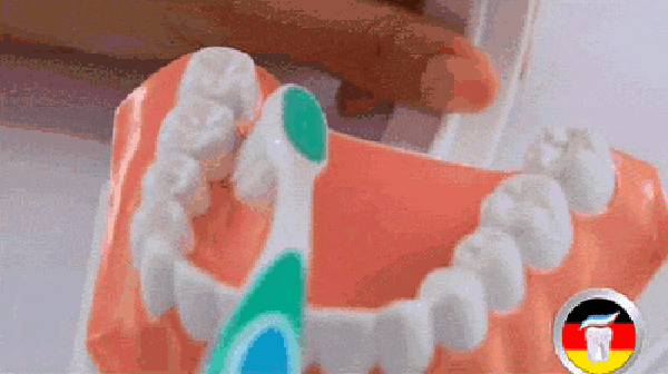 3. 有效刷牙能清除牙菌斑,是最主要的个人口腔维护方法。成人提倡用水平颤动拂刷法(如图),刷牙要面面俱到,重点清除牙龈边缘和牙缝处的菌斑,每次刷牙时间至少2分钟。儿童提倡用圆弧法刷牙,在儿童还不能流利地书写阿拉伯数字(6—7岁)之前,家长可帮助儿童刷牙。