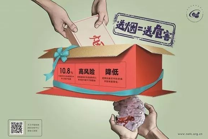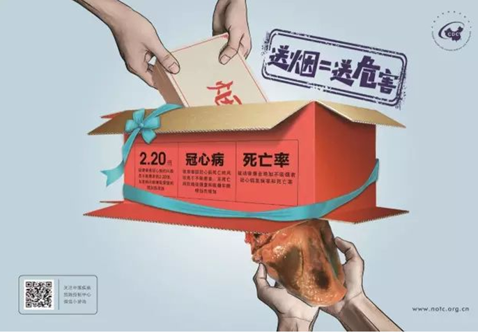 青岛市烟草调查报告显示,全市15岁以上居民现在吸烟率达到21.3%,有192万烟民,男性中4成是烟民;资深烟民平均每天吸烟17支以上,在全国位居前列;几乎一半的市民在家中暴露于二手烟。因此,“以烟为礼”的陋习亟待改变,“您把祝福连同肺癌等呼吸疾病一起送给了朋友。您把敬意连同心脏病、中风等心血管疾病一起送给了同事。您把关爱连同死亡一起送给了亲人。”