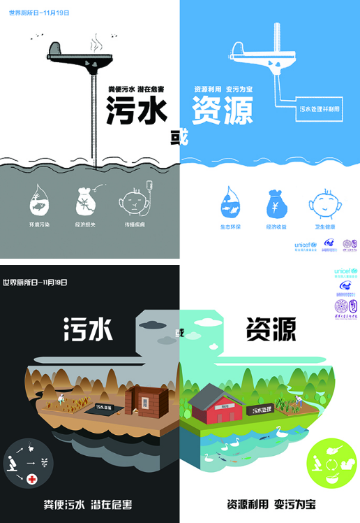 为了让大家更直观的感受粪尿处理的重要性,今年针对“污水或资源”的主题,中国疾病预防控制中心农村改水技术指导中心、联合国儿童基金会和清华大学共同设计了两组对比强烈的海报。