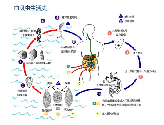 血吸虫的生活史包括卵、毛蚴、母胞蚴、子胞蚴、尾蚴、童虫和成虫等阶段,终宿主为人或其他多种哺乳动物,中间宿主为淡水螺类。传播途径包括虫卵入水、毛蚴孵出、侵入钉螺、尾蚴从镙体逸出和侵入终宿主的全过程。见图2。