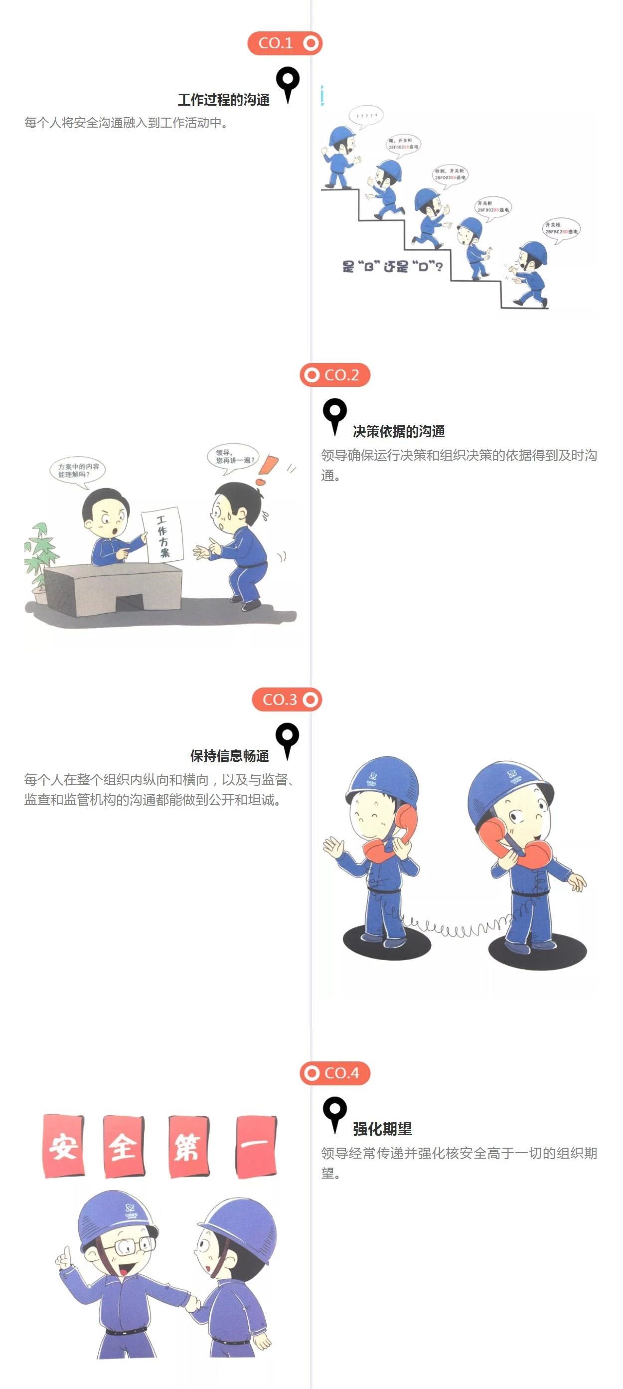 沟通关注安全(CO) 沟通交流时始终关注核安全。安全沟通是广泛的,包含了多个方面:电厂层面的沟通、工作相关的沟通、基层工作人员间的沟通、设备的标识、运行经验及文件记录。领导们采用正式或非正式的方式传递核安全的重要性。组织内由下至上的沟通和从上至下的沟通同样重要。