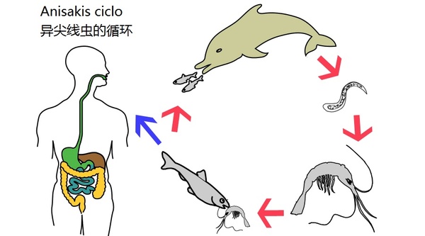 异尖线虫病对我们人类健康的影响主要有两方面:破坏消化道和导致过敏。由于异尖线虫可在消化道内移行,甚至钻入消化道内壁黏膜,造成消化道严重损坏,表现为恶心、腹痛、呕吐等症状。异尖线虫虫体及其分泌物会引发人体的过敏反应。主要症状为:水肿、风疹、呼吸障碍、甚至休克。