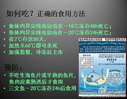 我们呼吁大家不要生吃或吃未煮熟的海水鱼,生熟砧板(菜板)要分开,以降低异尖线虫的潜在危害。