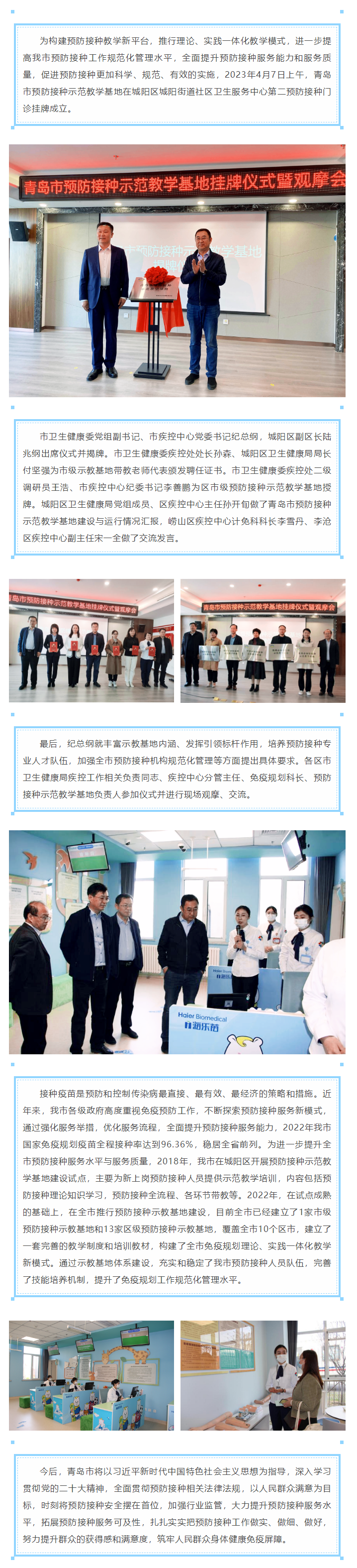 为构建预防接种教学新平台,推行理论、实践一体化教学模式,进一步提高我市预防接种工作规范化管理水平,全面提升预防接种服务能力和服务质量,促进预防接种更加科学、规范、有效的实施,2023年4月7日上午,青岛市预防接种示范教学基地在城阳区城阳街道社区卫生服务中心第二预防接种门诊挂牌成立。