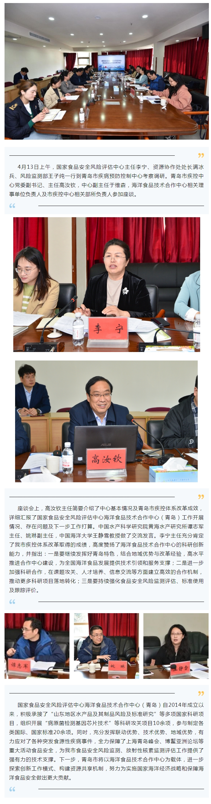 月13日上午,国家食品安全风险评估中心主任李宁、资源协作处处长满冰兵、风险监测部王子纯一行到青岛市