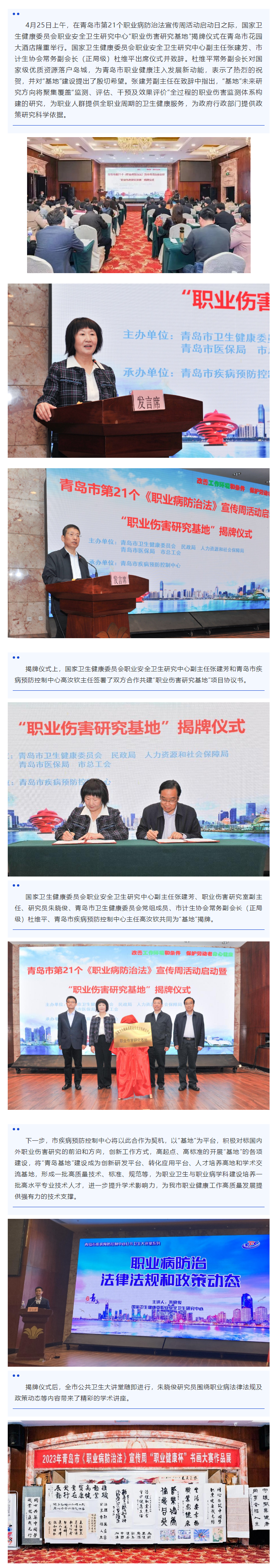 4月25日上午,在青岛市第21个职业病防治法宣传周活动启动日之际,国家卫生健康委员会职业安全卫生研究中心“职业伤害研究基地”揭牌仪式在青岛市花园大酒店隆重举行。