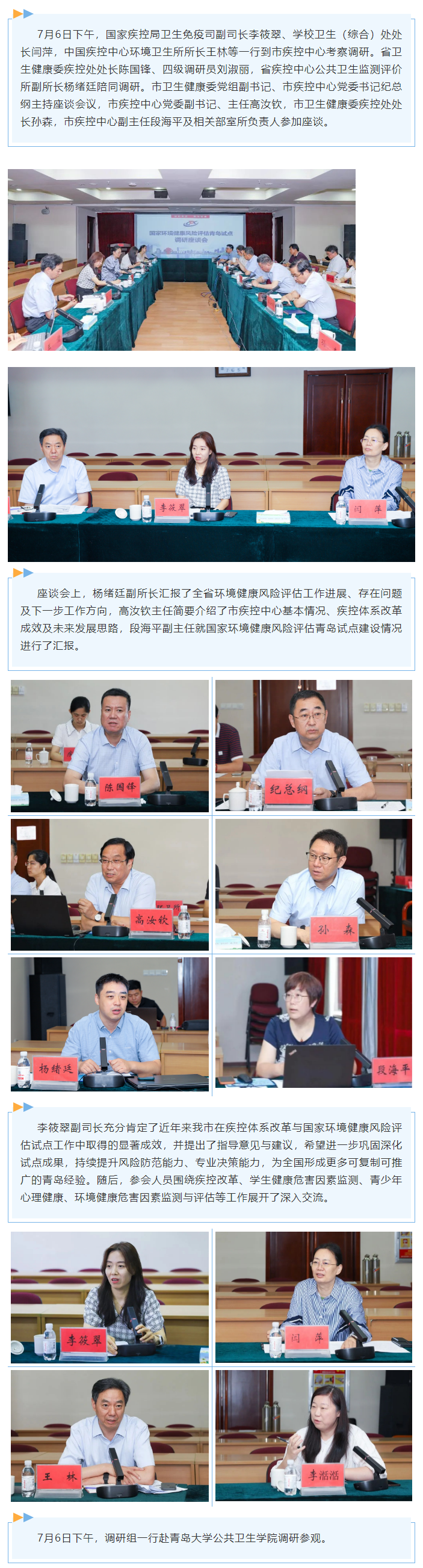 7月6日下午,国家疾控局卫生免疫司副司长李筱翠、学校卫生(综合)处处长闫萍,中国疾控中心环境卫生所所长王林等一行到市疾控中心考察调研。省卫生健康委疾控处处长陈国锋、四级调研员刘淑丽,省疾控中心公共卫生监测评价所副所长杨绪廷陪同调研。