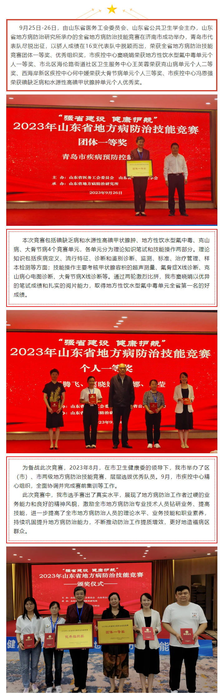 月25日-26日,由山东省医务工会委员会、山东省公共卫生学会主办,山东省地方病防治研究所承办的全省地方病防治技能竞赛在济南市成功举办,青岛市代表队尽锐出征,以骄人成绩在16支代表队中脱颖而出,