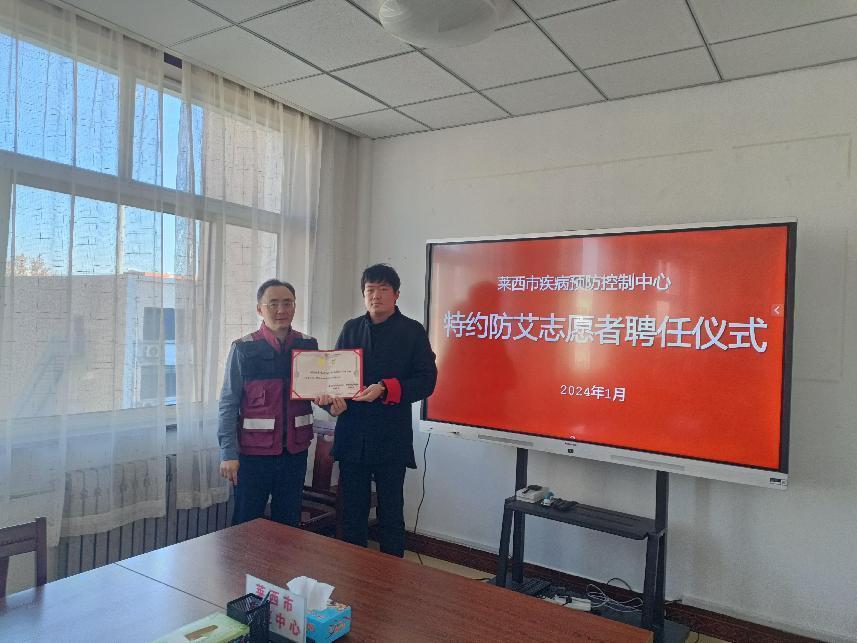 为积极贯彻响应艾滋病防治工作全社会参与的号召,更好促进莱西市艾滋病防治工作开展,2024年1月15日,莱西市疾控中心举办了社会特约防艾志愿者聘任仪式。莱西市疾控中心王庆玺主任、韩德纲副主任出席聘任活动并为特约防艾志愿者颁发了聘任证书,青岛青同防艾志愿服务中心相关工作人员参加本次活动。