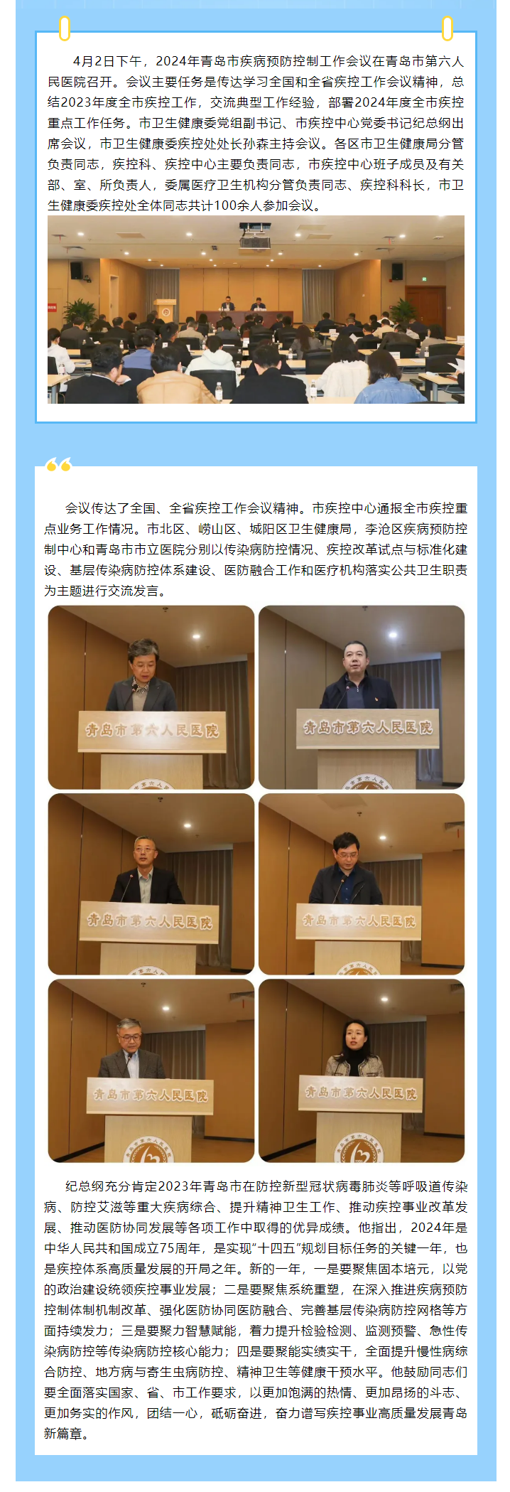 月2日下午,2024年青岛市疾病预防控制工作会议在青岛市第六人民医院召开。会议主要任务是传达学习全国和全省疾控工作会议精神,总结2023年度全市疾控工作,