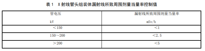 5.1.1 X 射线探伤机在额定工作条件下,距 X 射线管焦点 100 cm 处的漏射线所致周围剂量当量率应符合表 1 的要求,在随机文件中应有这些指标的说明。其他放射防护性能应符合 GB/T 26837 的要求。