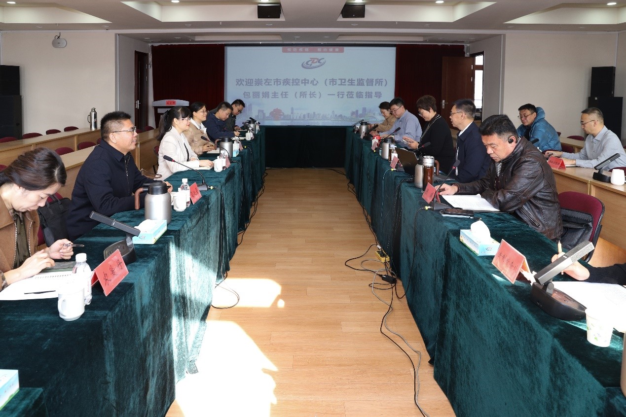 座谈会上,吕坤政主任首先对包丽娟主任一行的到来表示热烈欢迎,并介绍了中心改革发展基本情况。包丽娟主任对我市疾控体系改革与运行机制、传染病监测预警与应急处置、卫生监督执法能力建设等方面工作给与高度评价,并介绍了广西崇左市疾控和监督工作开展情况。