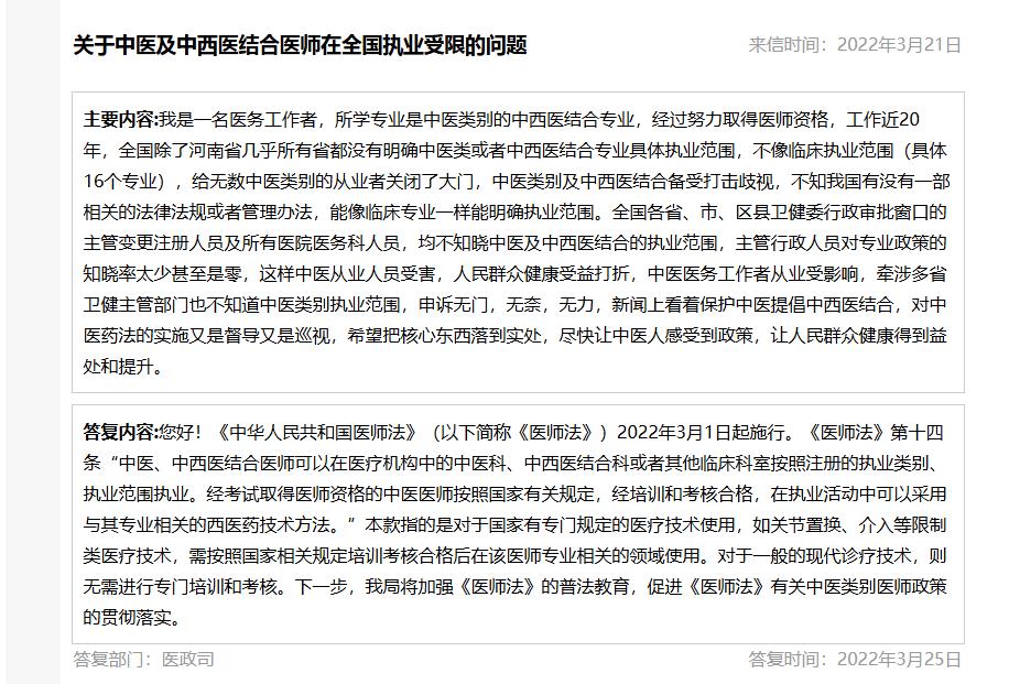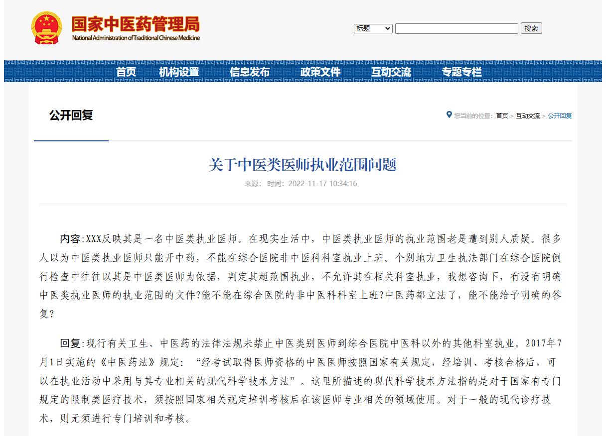 有些人认为中医、中西医结合医师只能在中医(中西医结合)医院或者综合医院的中医科工作,这是混淆了执业范围与所在科室的概念,简单、笼统地认为“执业范围=执业科室”,对此国家相关部门有明确答复。