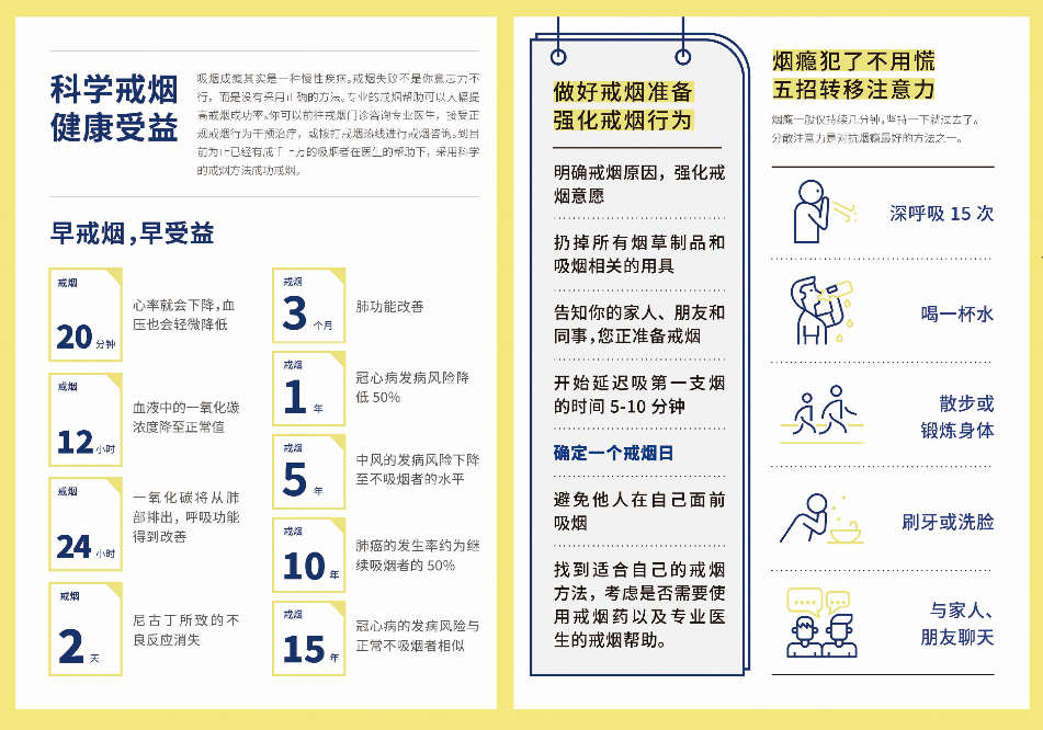 15 年后:冠心病的发病风险与不吸烟人群基本持平;寿命会比继续吸烟的人延长5-10年。