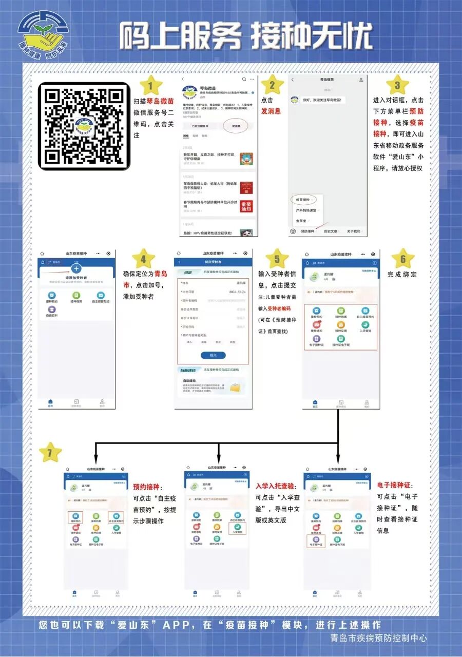 为方便预约,山东省已在“爱山东”政务服务平台(APP及小程序)的“疫苗接种”模块中开通了“自主疫苗预约”服务,您可随时登录平台进行预约。或者通过"琴岛微苗"服务号里面的"预防接种"模块,选择"疫苗接种"服务进行预约。如对接种有任何疑问,欢迎拨打所在区市疾控中心咨询电话,或联系就近的预防接种门诊进行了解。